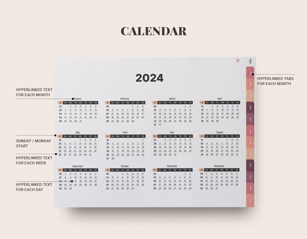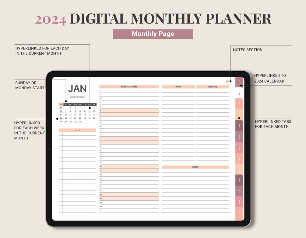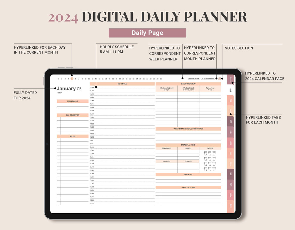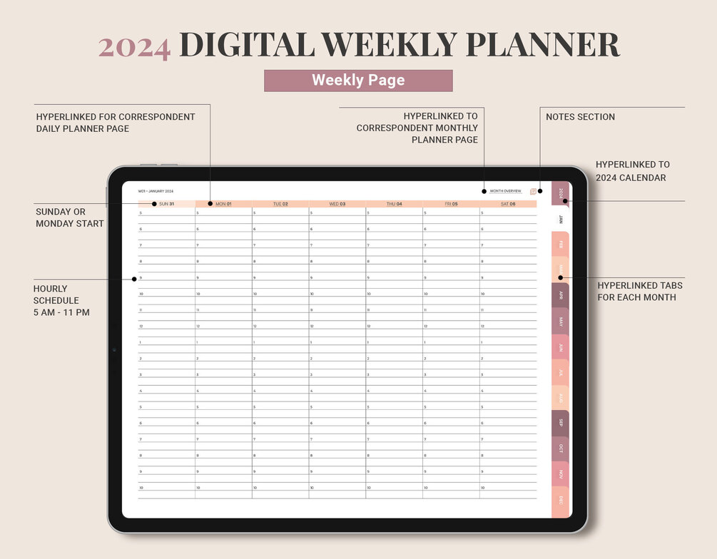 The 2024 digital planner is a powerful tool for planning, organizing, and taking notes on your iPad or Android tablet. This planner is equipped with 452 pages total, 2024 Dated daily and weekly pages, a hyperlinked 2024 Calendar page, 6 Cover Color Options, 5 Notes Designs. Hourly Daily Schedule (5.00am- 11.00pm). Monday or Sunday Week Start.