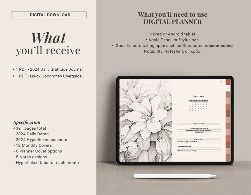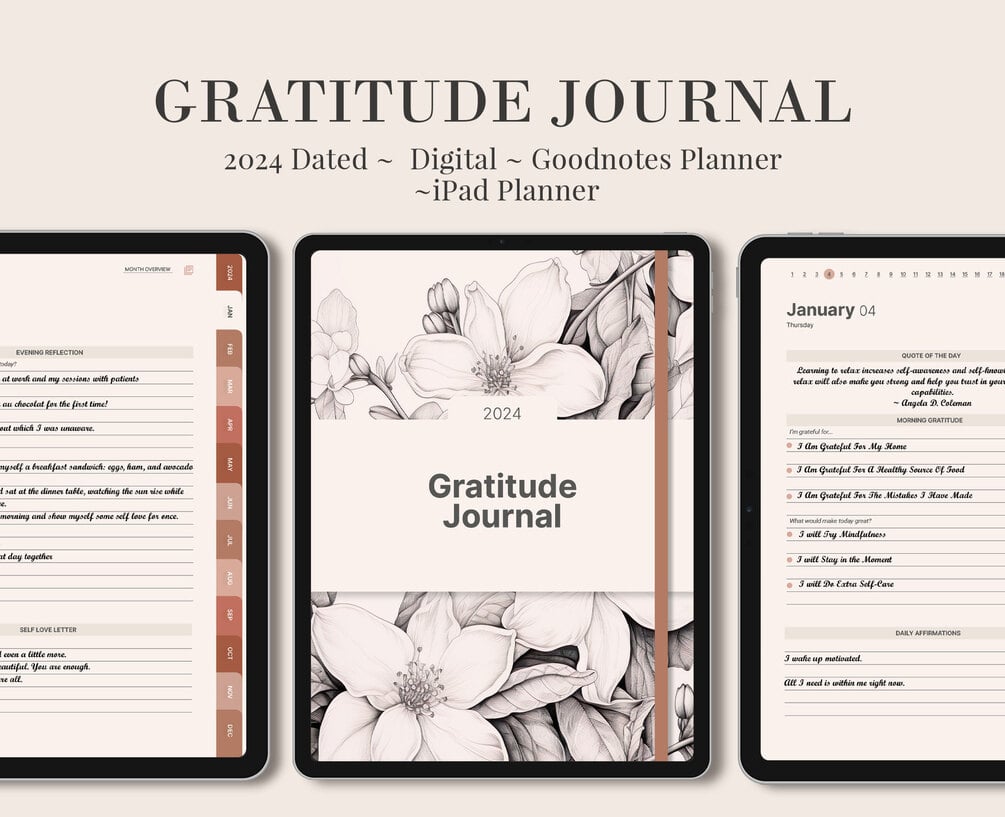 The 2024 Digital Gratitude Journal is your guide to establishing positive habits through a daily gratitude practice. With complete dates for 2024, this simple yet effective tool is perfect for starting and concluding your day on a positive note.