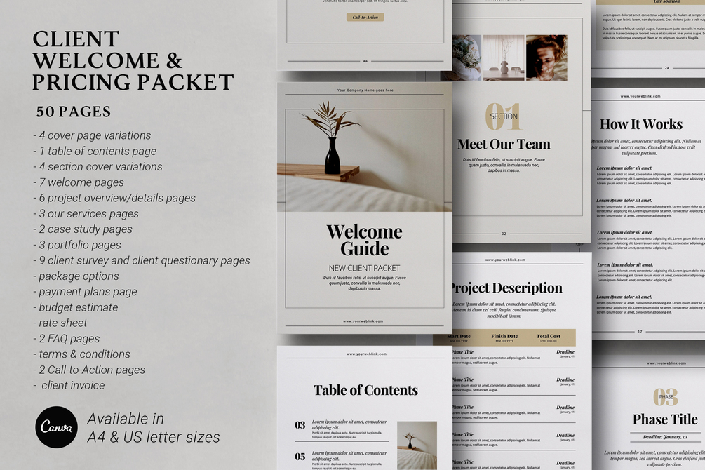 Client Welcome & Pricing Packet - 50 Pages in Canva Format, US Letter, and A4 Sizes