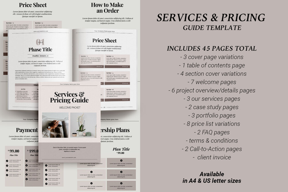 Services and Pricing Welcome Packet template - 45 Pages in Canva Format, US Letter, and A4 Sizes