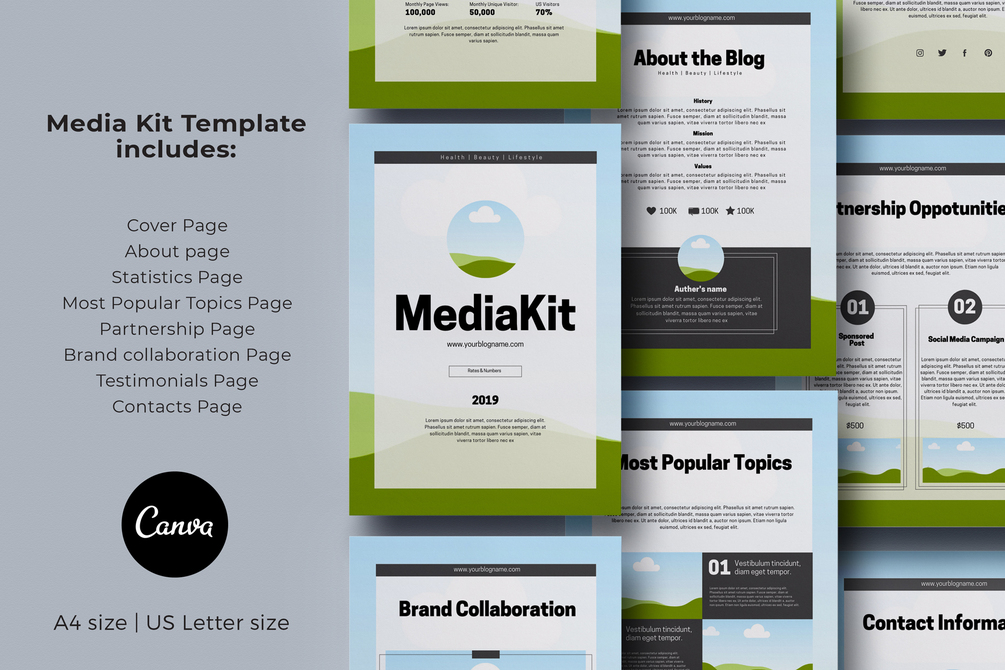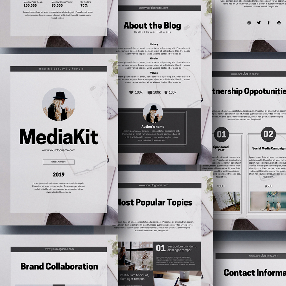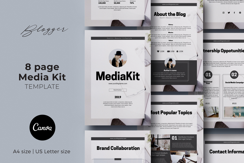 8 Pages Blogger Media Kit CanvaTemplate includes: