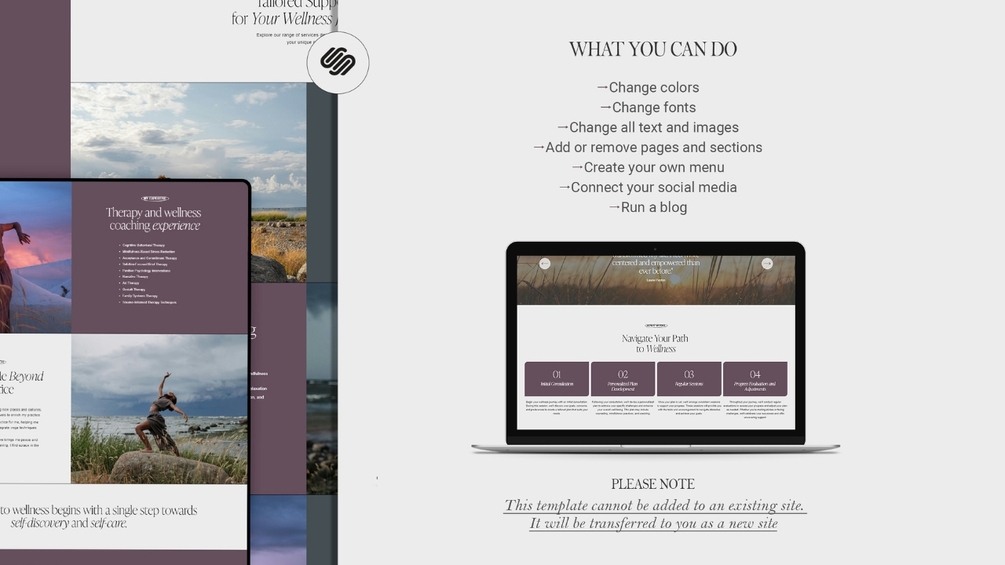 - This template is exclusively designed for Squarespace and is NOT compatible with other website platforms such as Wix, Showit, or Wordpress.