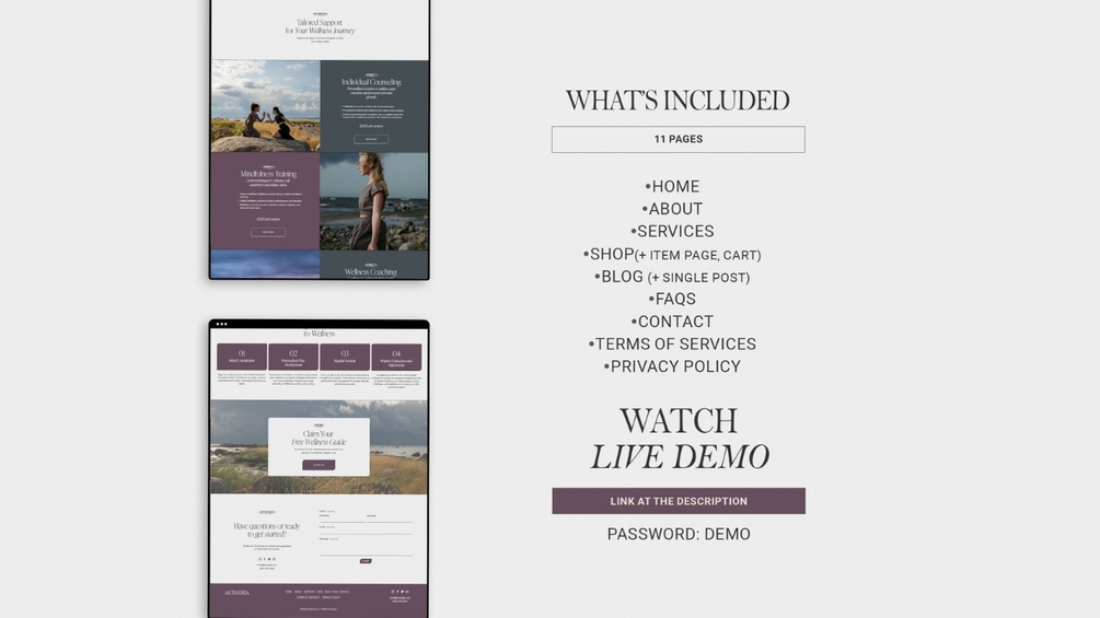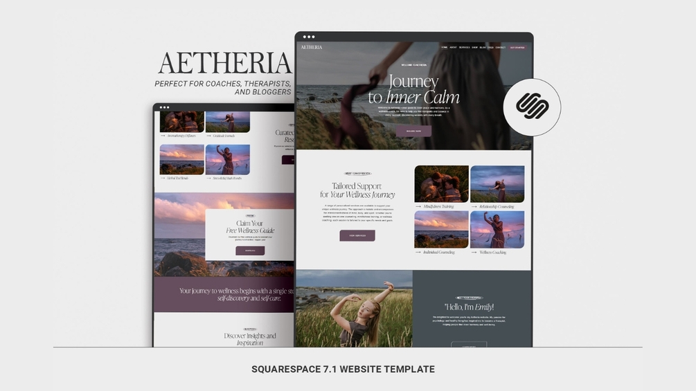 AETHERIA — Wellness Coach Website Template for Squarespace. Ideal for therapists, wellness coaches, holistic counselors, mental health bloggers and psychologists.