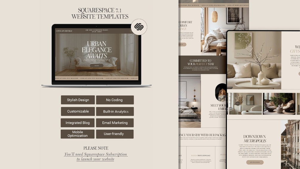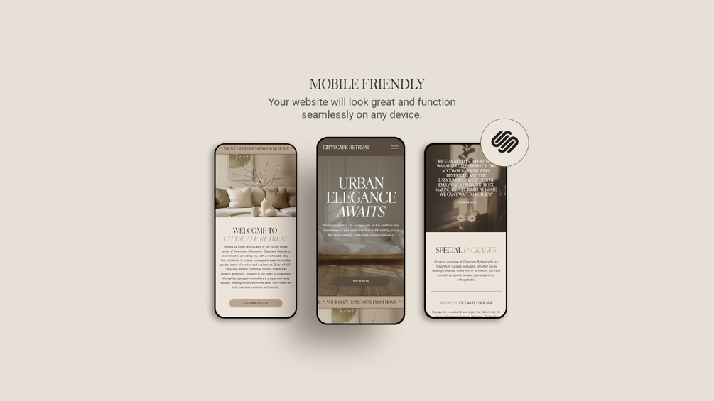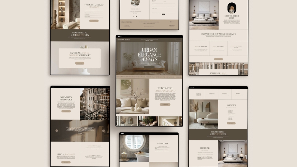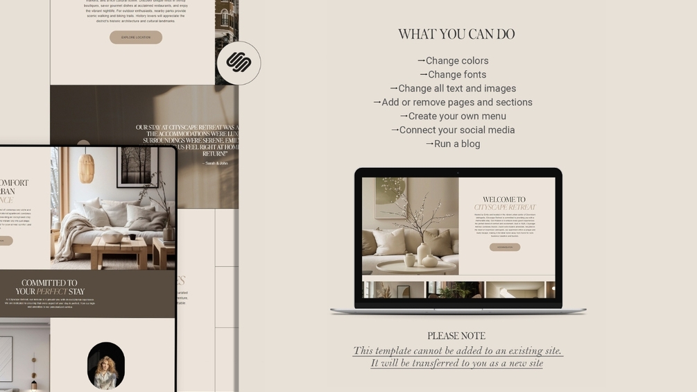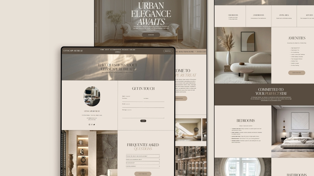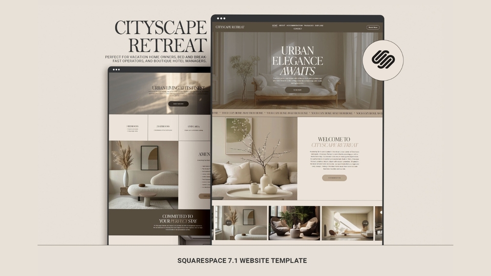 CITYSCAPE RETREAT - Squarespace Website Template. Ideal for airbnb hosts, vacation home owners, bed and breakfast operators, and boutique hotel managers.