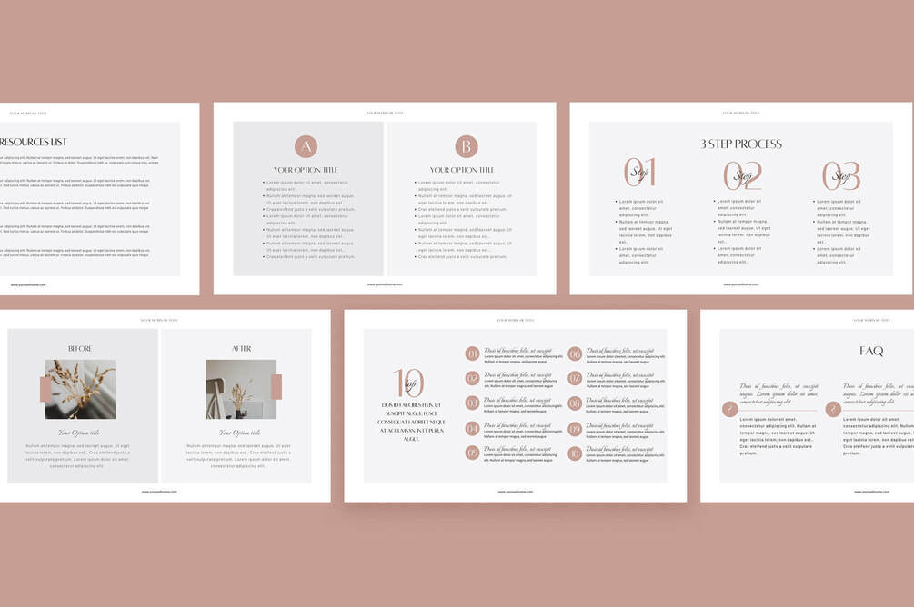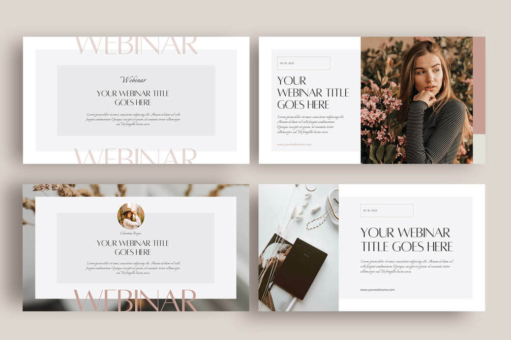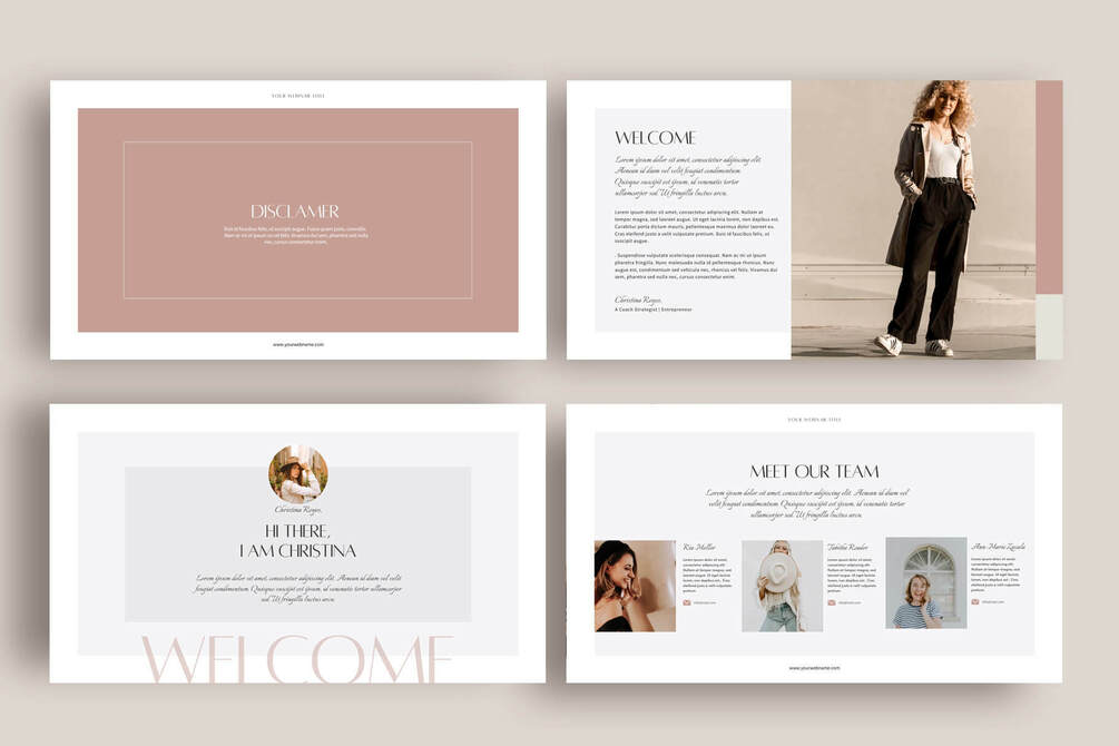 42 page Webinar Slide Deck Canva template that will help you to design an elegant presentation for your next webinar, workshop, masterclass or online course.
