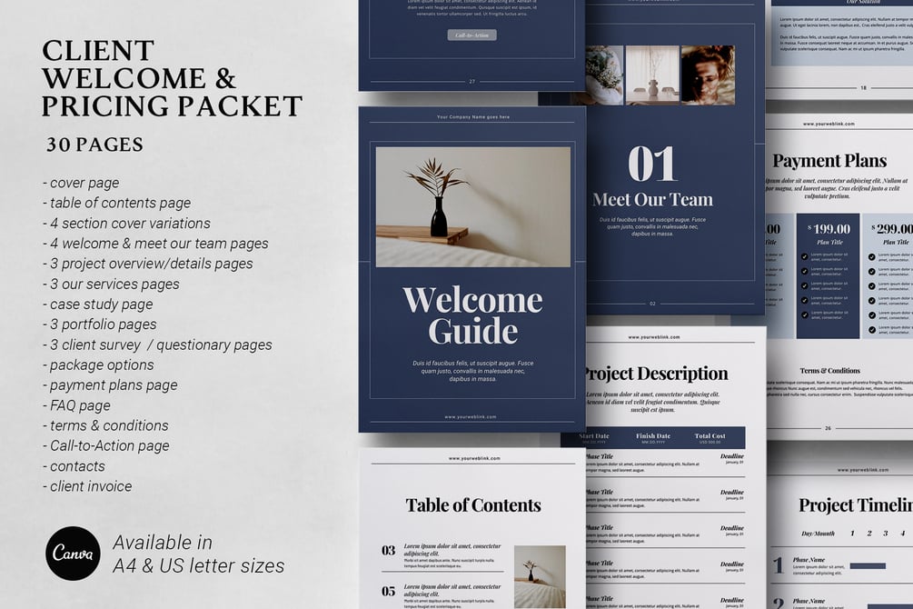 Client Welcome and Pricing Packet - 30 Pages in Canva Format, US Letter, and A4 Sizes