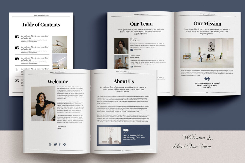 This template is ideal for creating client welcome packets, price lists, services & product guides, and project proposals.