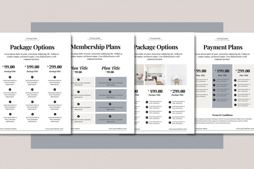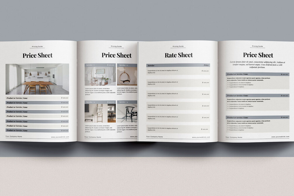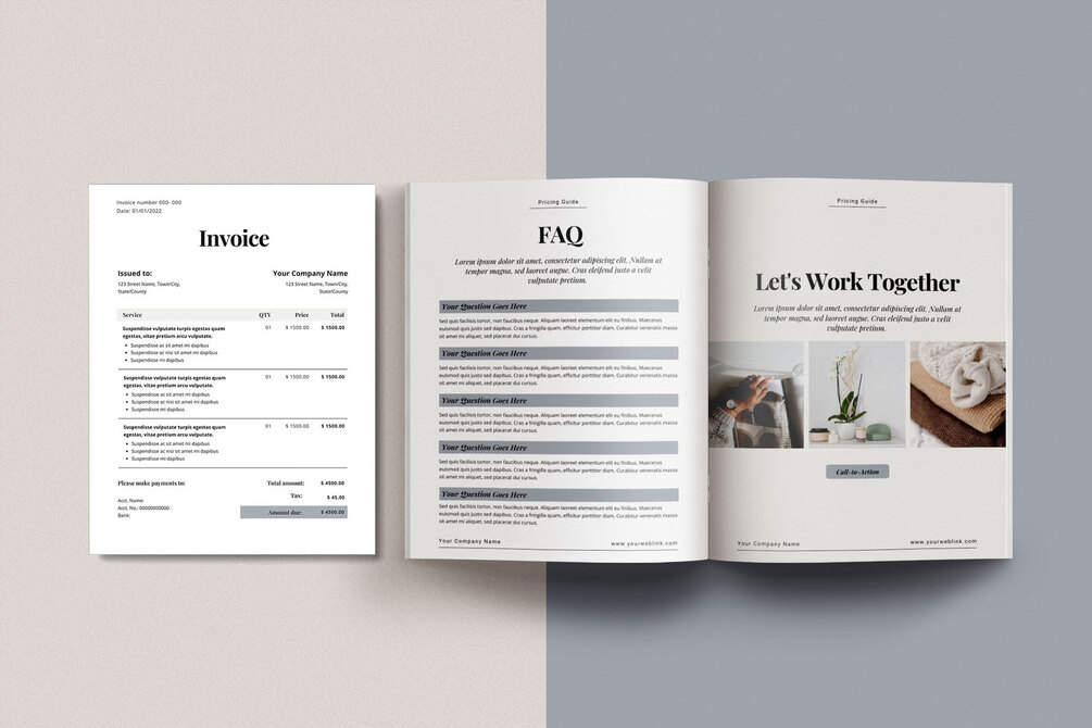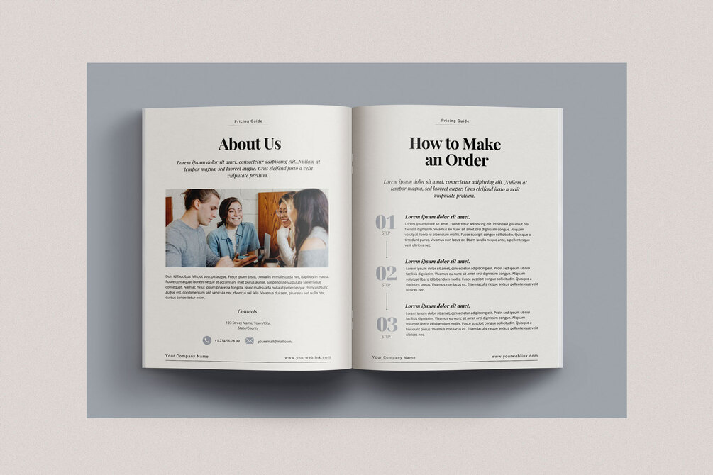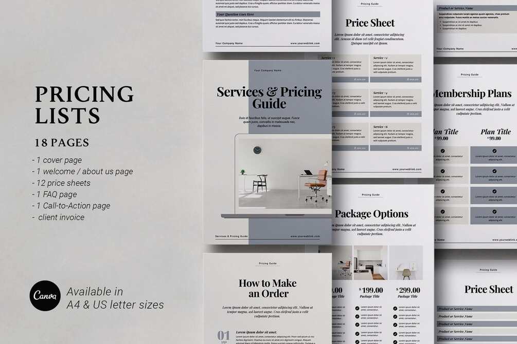 The template is fully editable and available in Canva format, A4 (210x297mm), and US Letter (8.5x11 inches) sizes. All you need to edit the Pricing list template is a totally free Canva account. PDF instruction with direct links is included in the package.