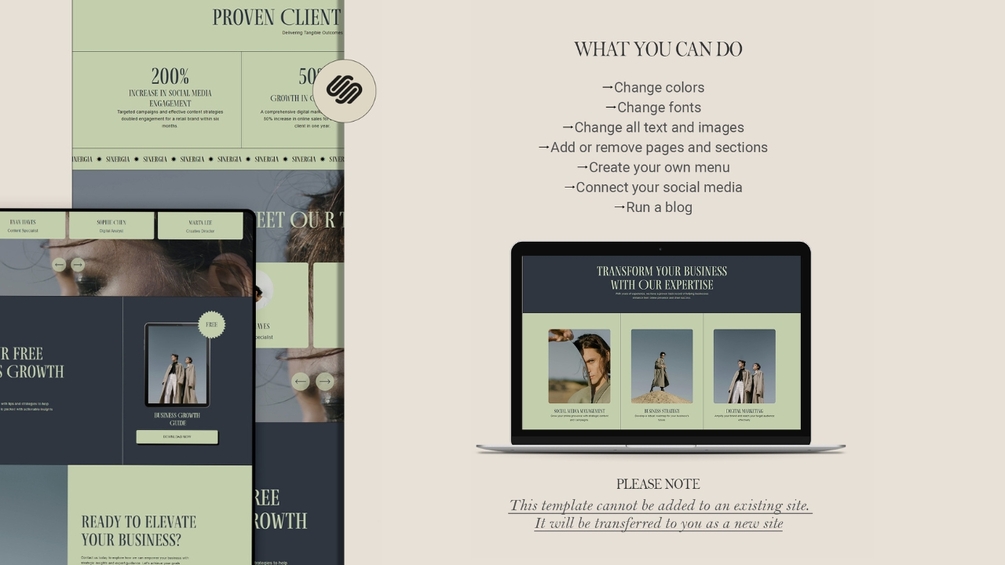 - This template is exclusively designed for Squarespace and is NOT compatible with other website platforms such as Wix, Showit, or Wordpress.