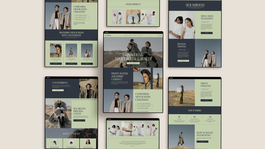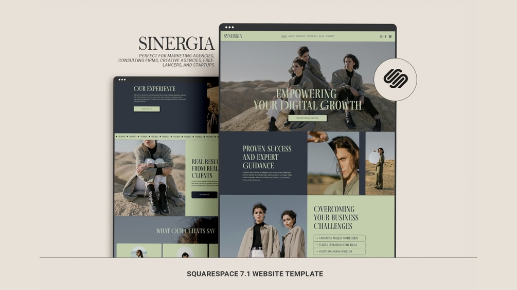 SINERGIA - Squarespace Website Template. Perfect for marketing agencies, consulting firms, creative agencies, freelancers, and startups looking to showcase their services and achievements effectively.