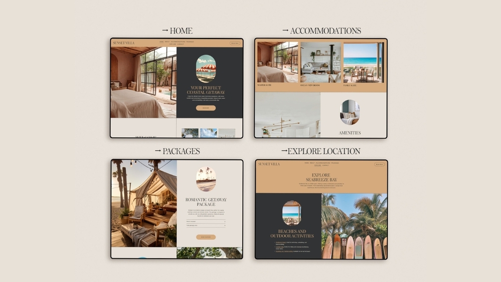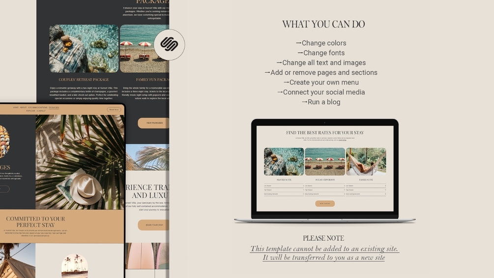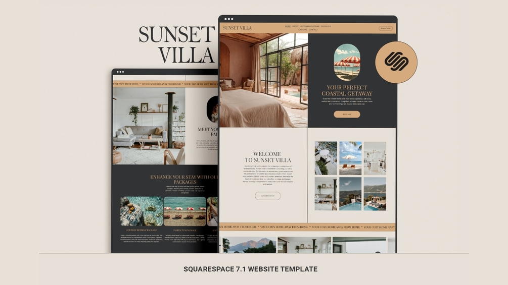 SUNSET VILLA - Squarespace Website Template. Ideal for vacation home owners, bed and breakfast operators, and boutique hotel managers.