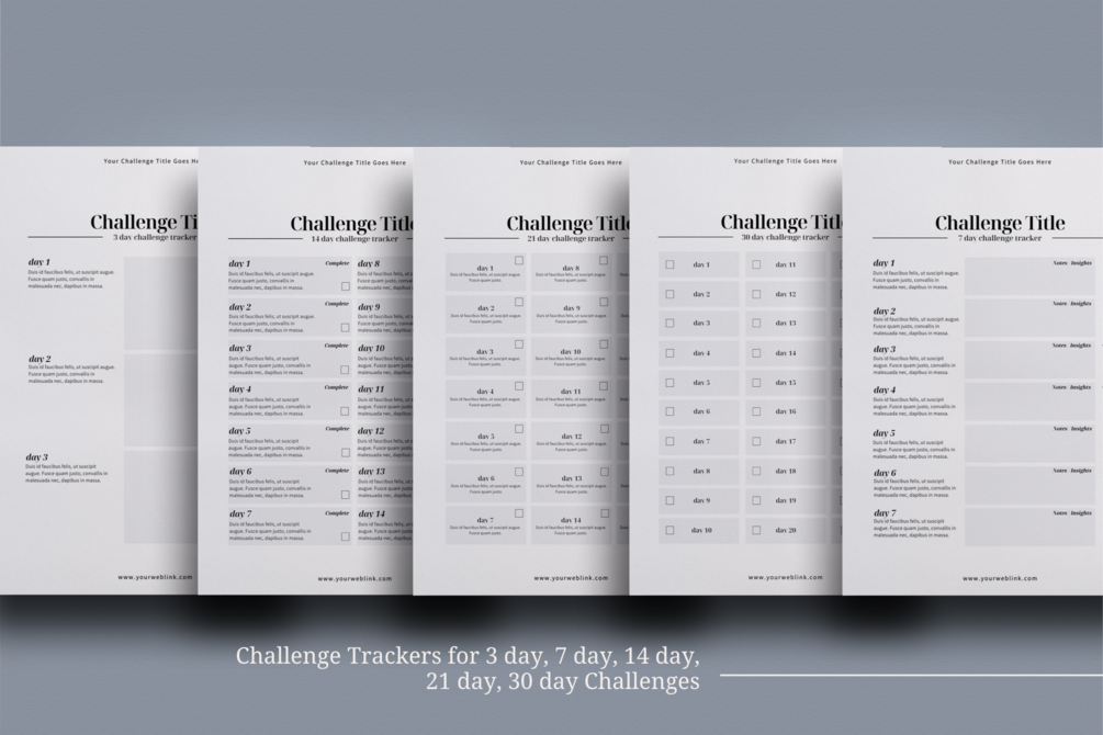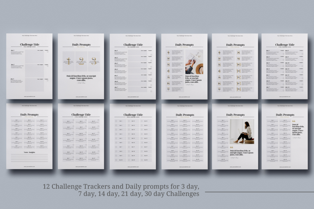• 12 Challenge Trackers and Daily prompts for 3 day, 7 day, 14 day, 21 day, 30 day Challenges