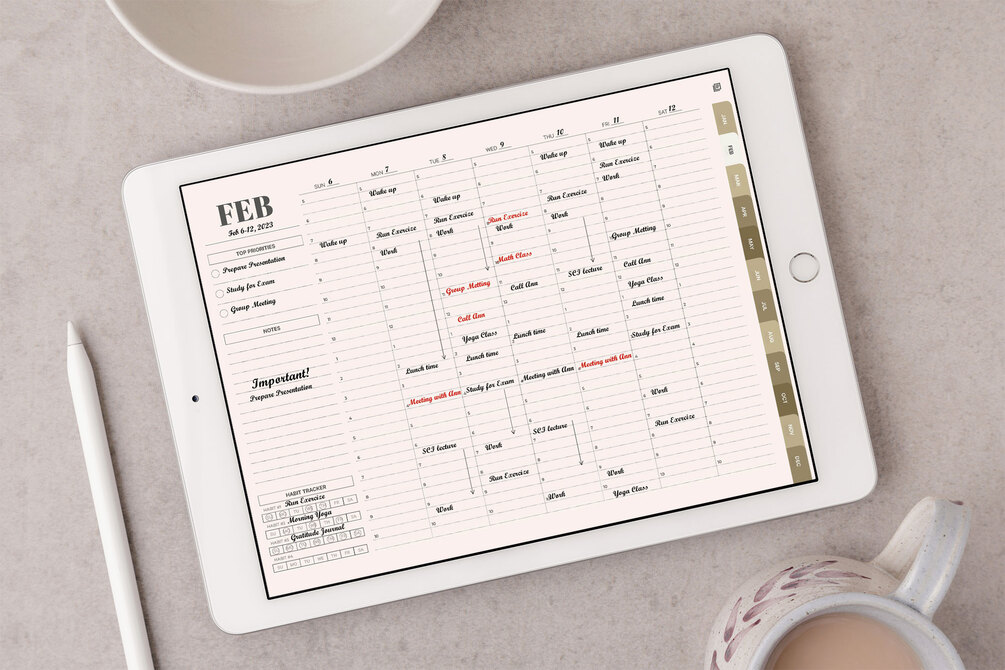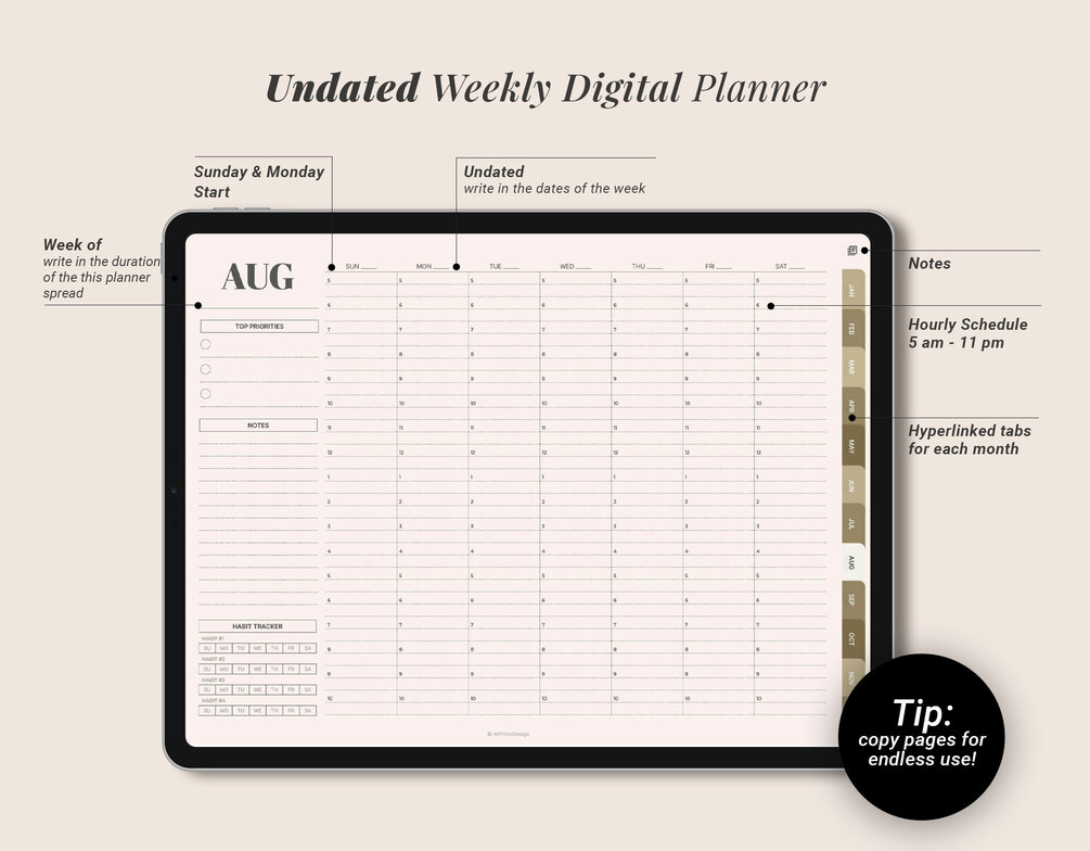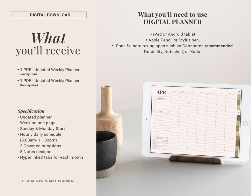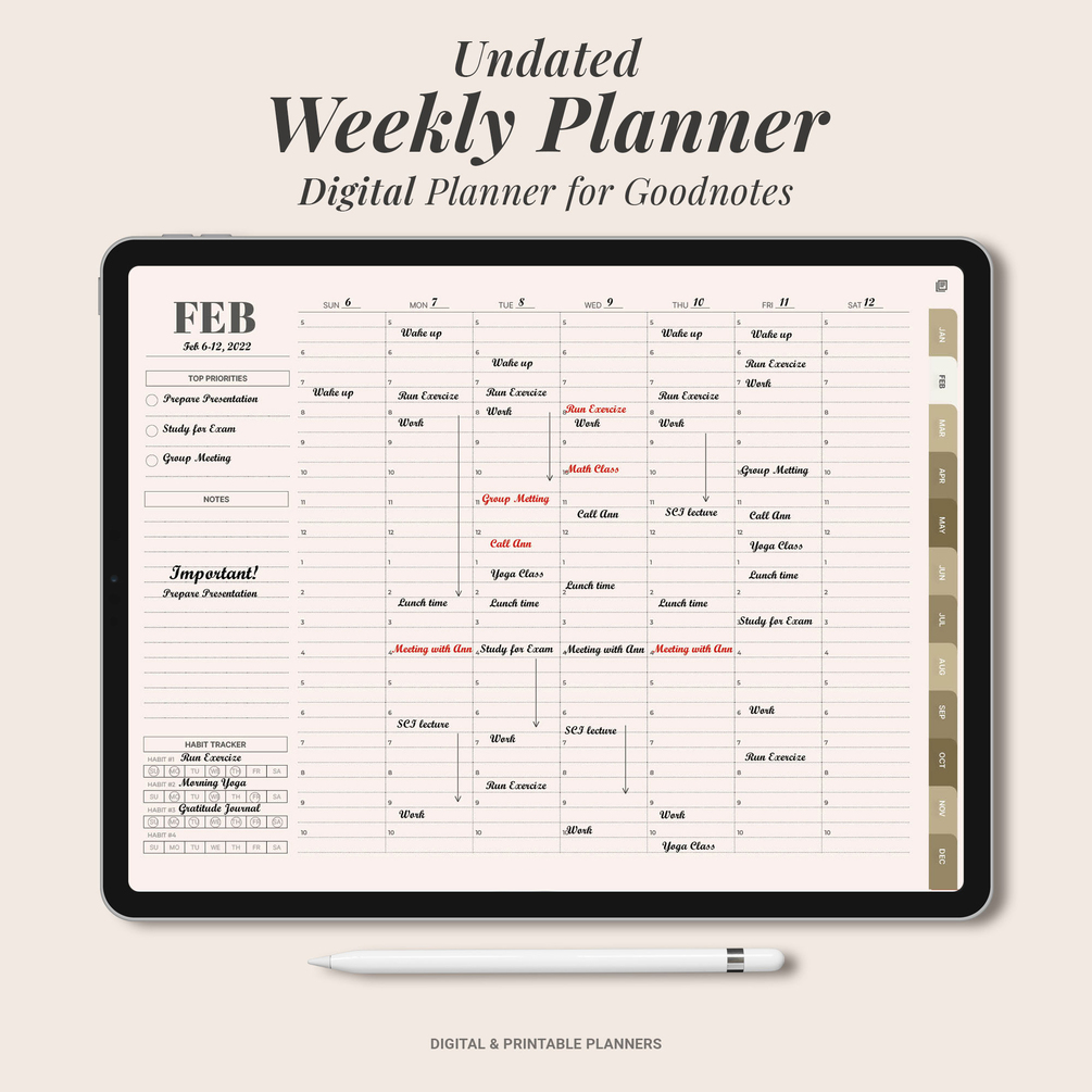 The Undated Weekly Digital Planner for GoodNotes is the perfect tool for staying organized and on top of your weekly tasks. It features a stylish design with a landscape format, making it easy to view your week at a glance. The planner is undated, so you can start using it anytime and copy and paste pages to use them forever.