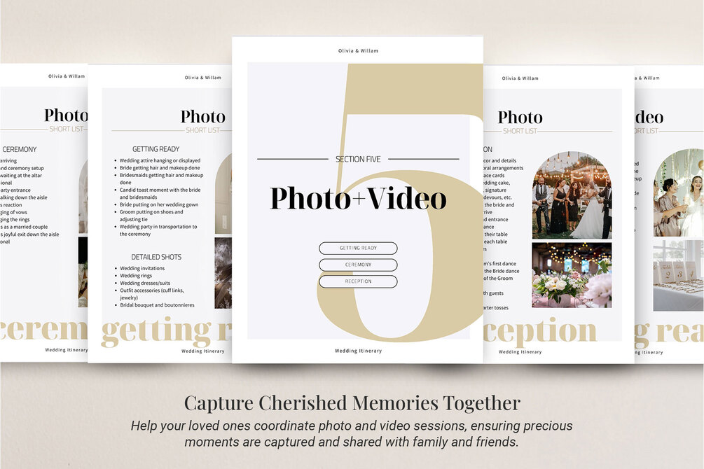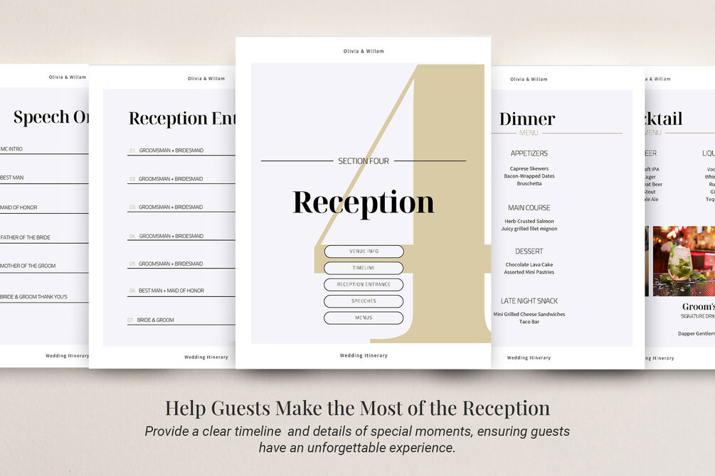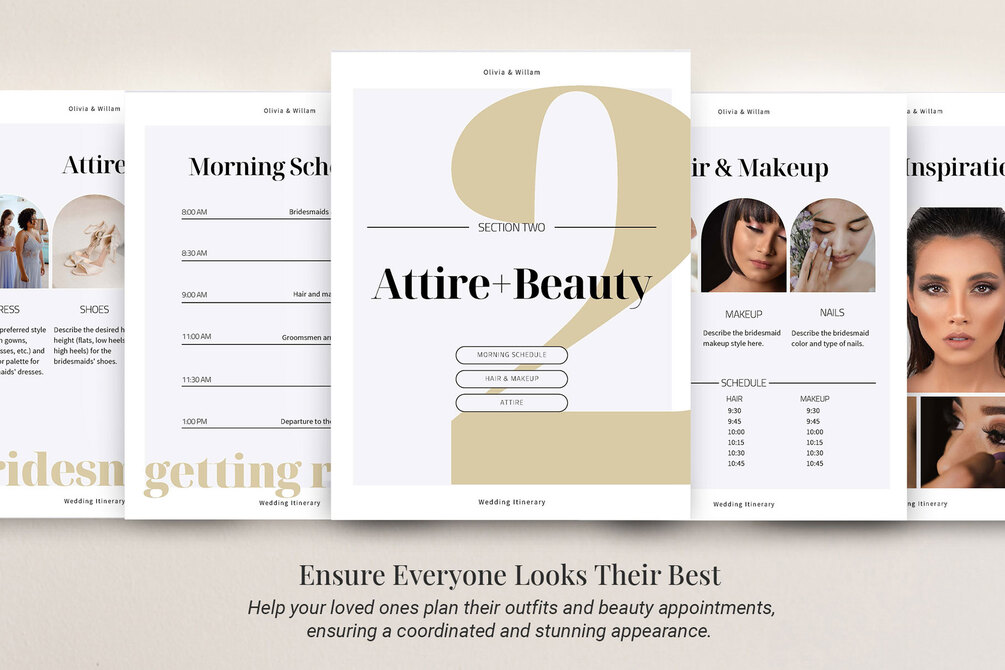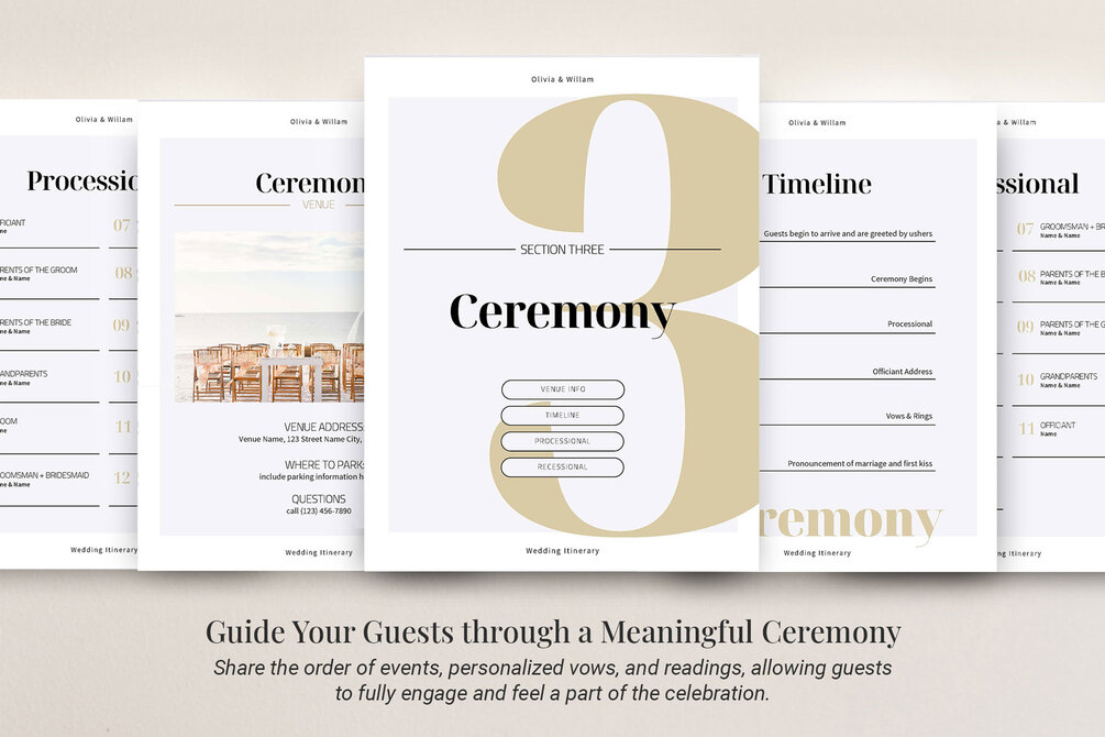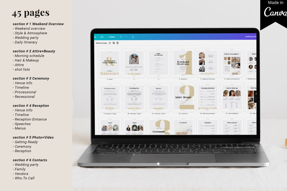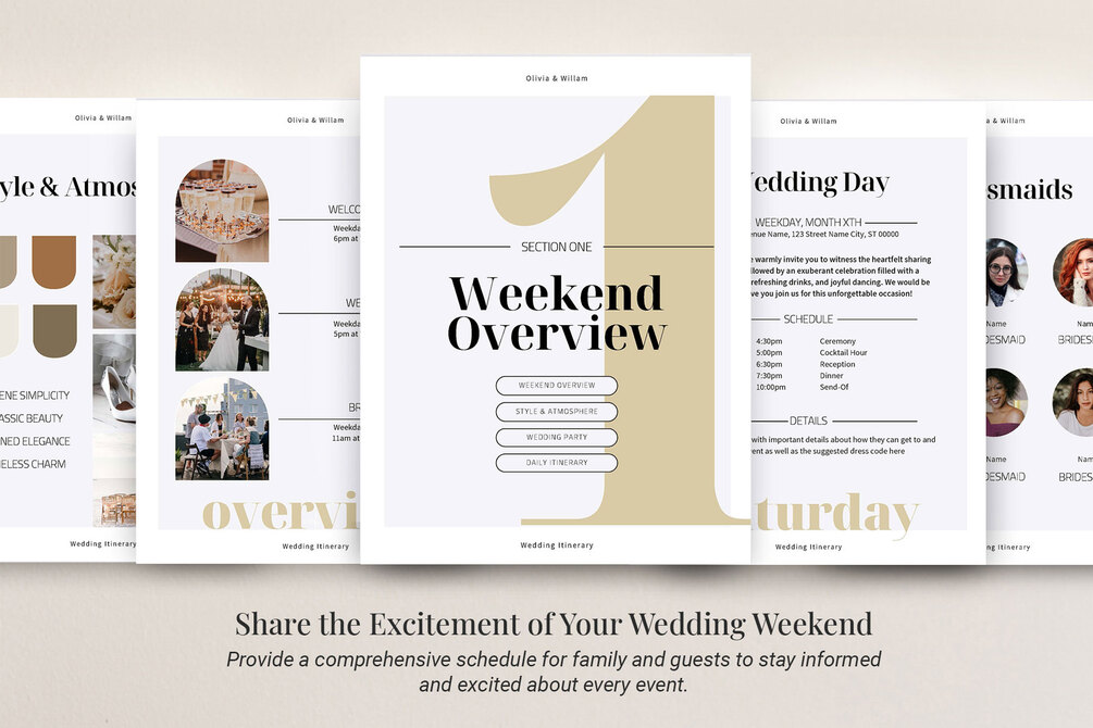 The Wedding Itinerary Template, crafted to simplify your wedding planning process. This Weekend Guide will help you to organize and share your wedding day details in a stylish and professional manner. This digital download includes a 45-page editable Canva template with a printable PDF option to use as a wedding book or weekend guide. Available in A4 and US Letter sizes. The template is designed to separate essential elements into organized sections, including Weekend overview, Attire+beauty, Ceremony, Reception, Photo+video, and Contacts. With this wedding organizer, you can easily keep your guests informed and involved in your special day.