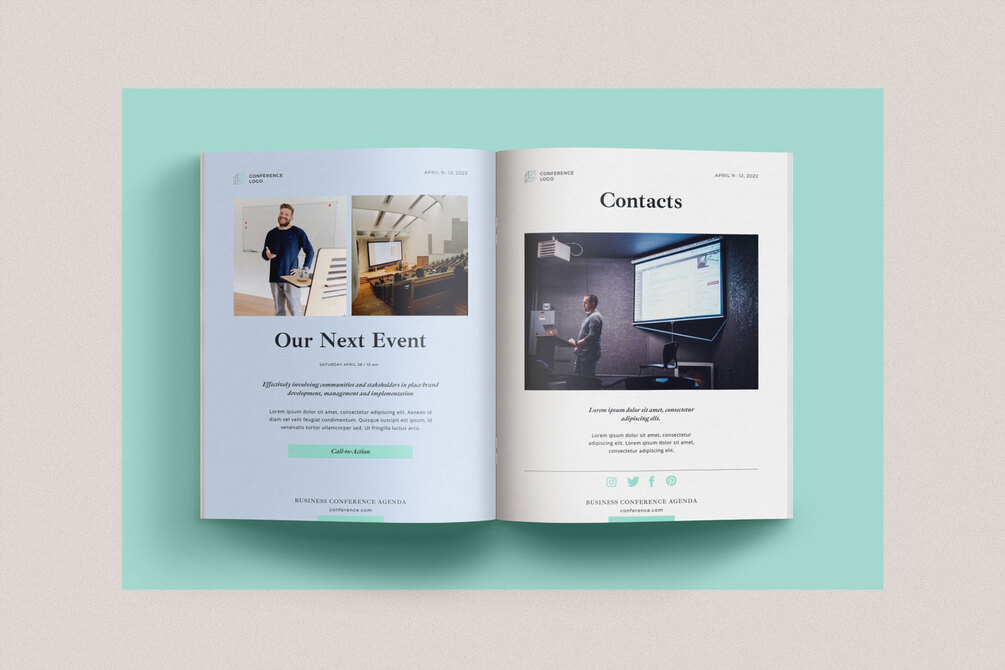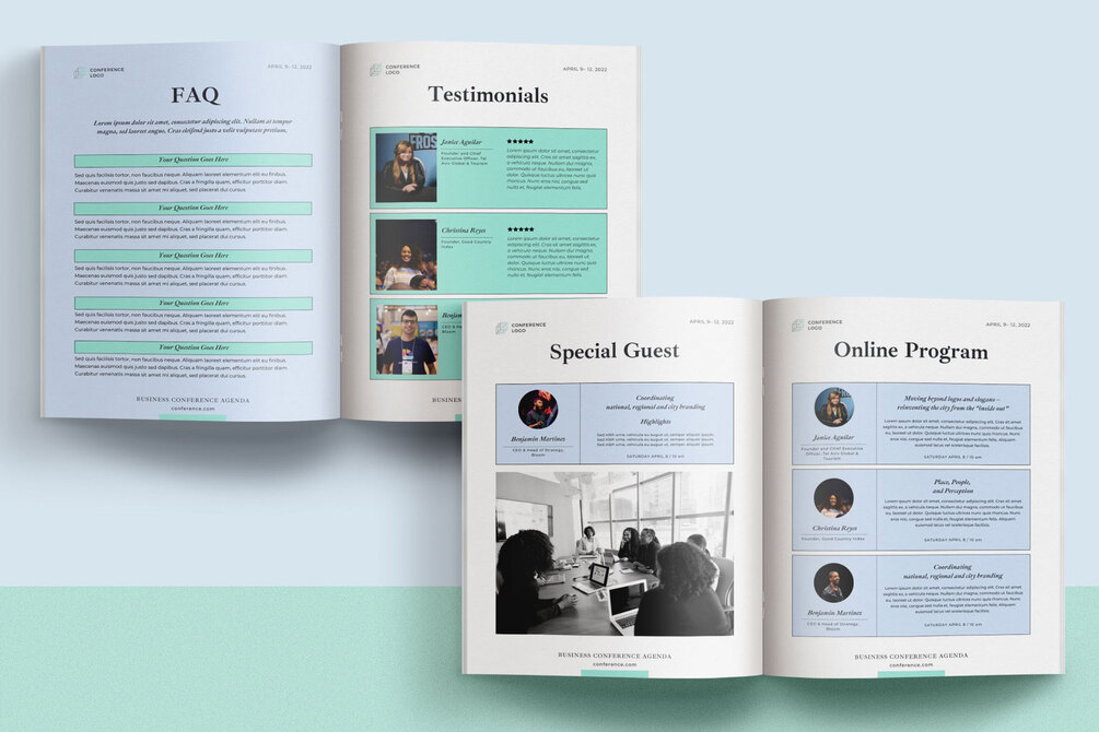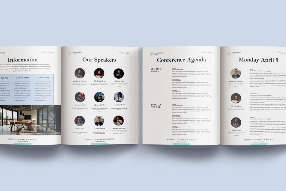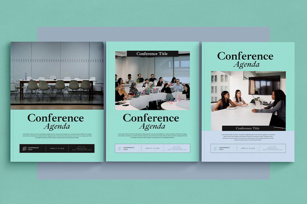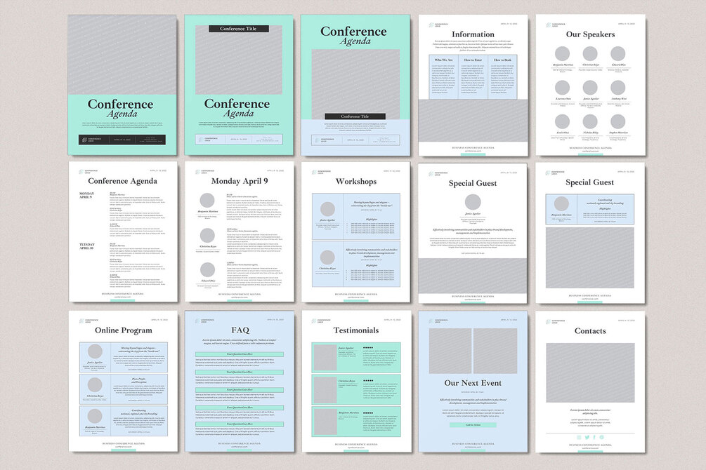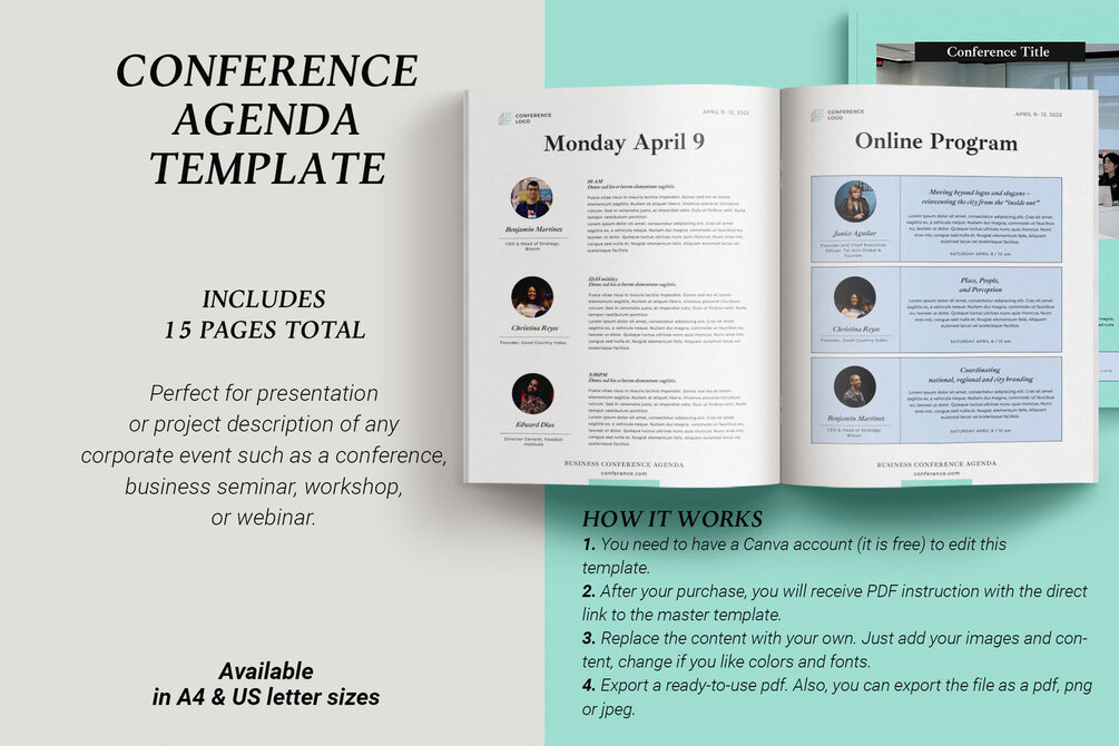 15-page Conference Agenda Canva Template. Perfect for presentation or project description of any corporate event such as a conference, business seminar, workshop, or webinar.
