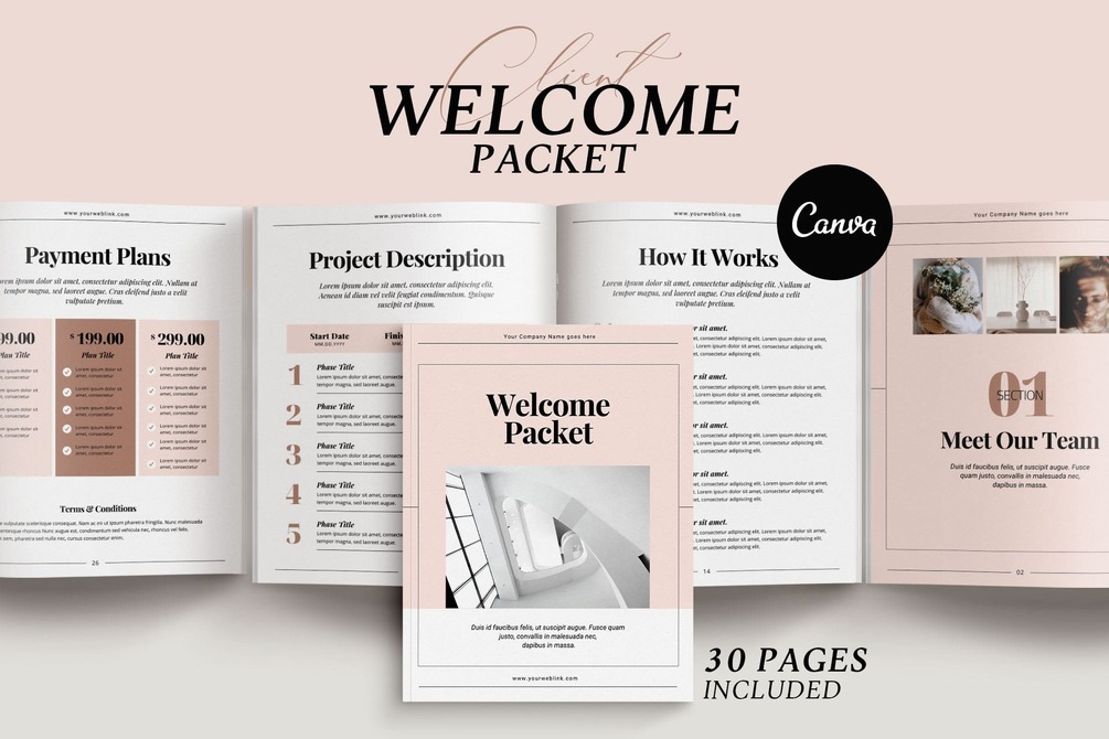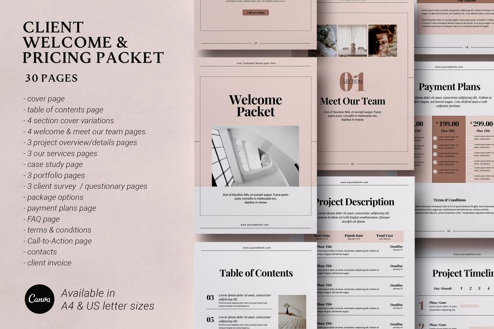 Client Welcome and Pricing Packet - 30 Pages in Canva Format, US Letter, and A4 Sizes