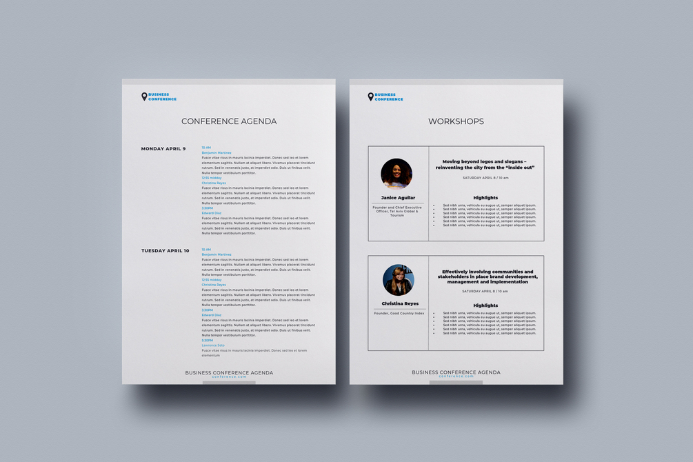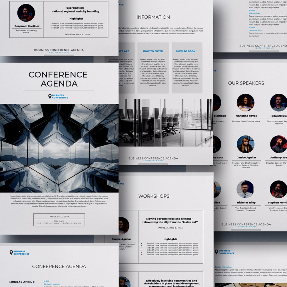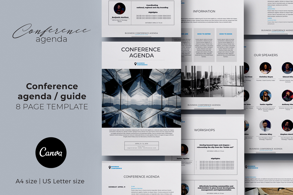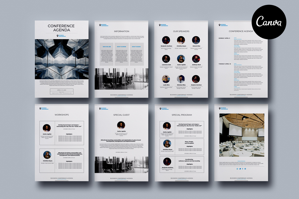 8-page Conference Agenda Canva Template for presentation or project description of any corporate event such as a conference, business seminar, special workshop or webinar.